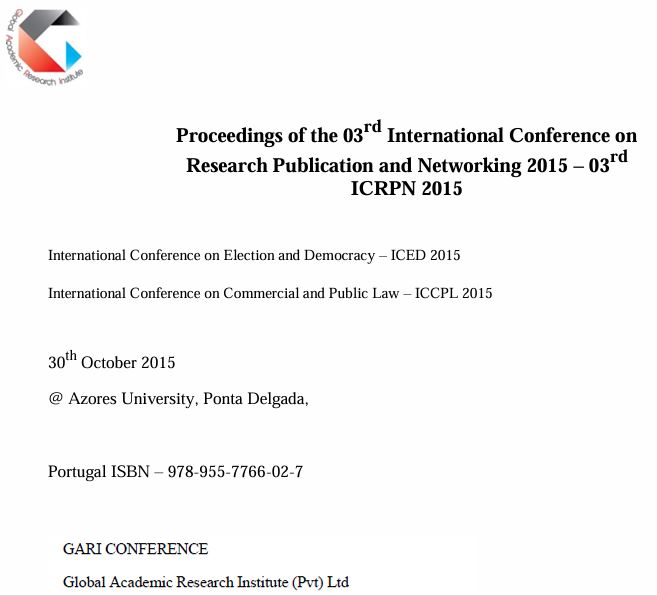 Proceedings of the 03rd International Conference on Research Publication and Networking 2015 – 03rd ICRPN 2015 International Conference on Election and Democracy – ICED and International Conference on Commercial and Public Law – ICCPLWebsite: https://globalacademicresearchinstitute.com/proceedings